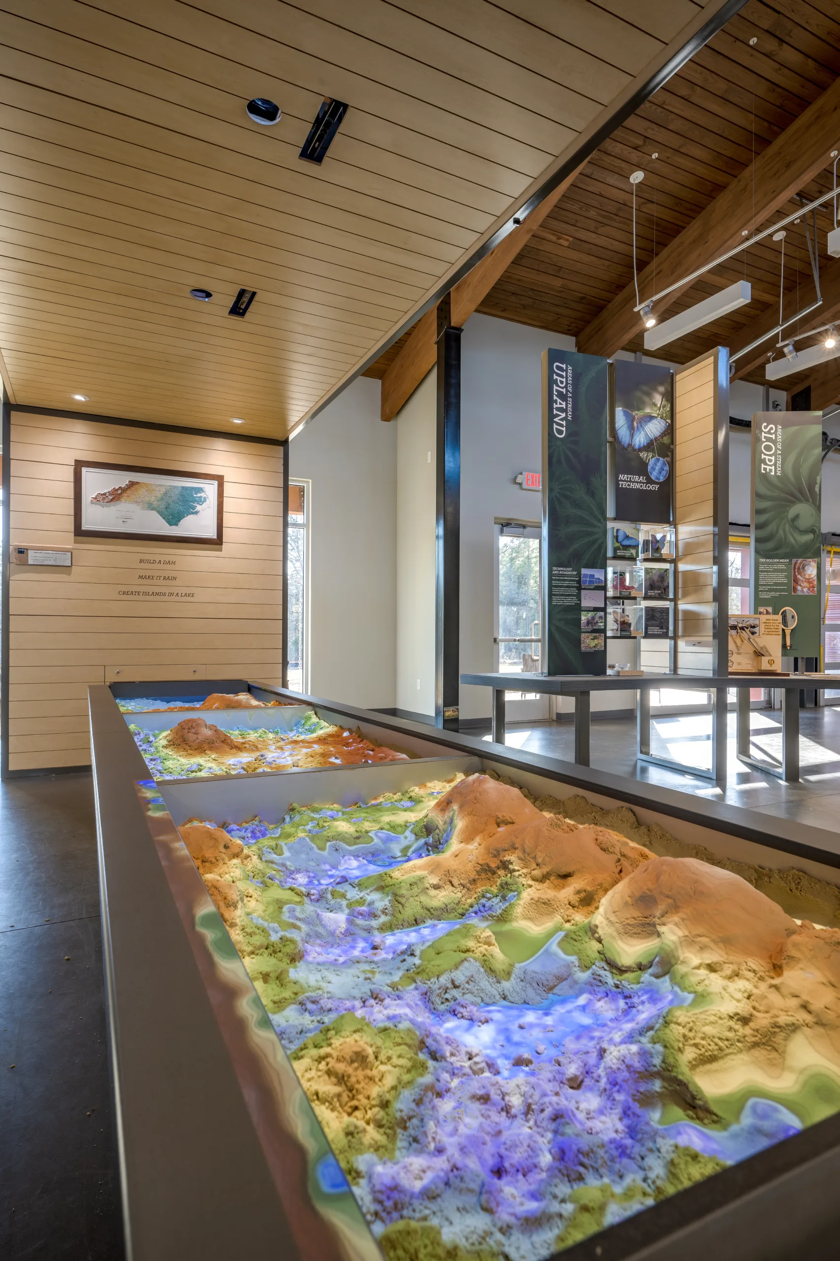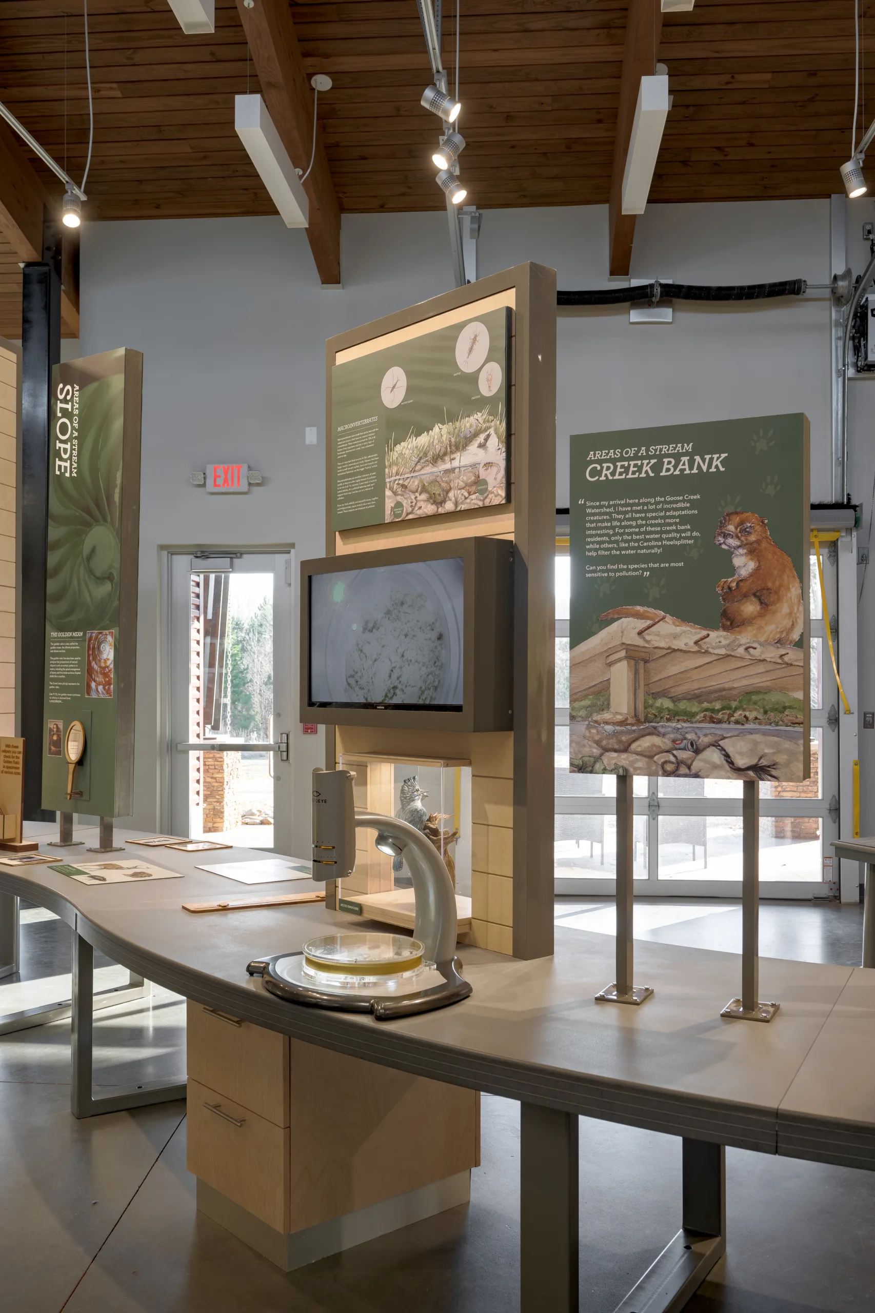 Riggs Ward Design created a playful, hands-on exhibit for the Stevens Creek Nature Center, a 281-acre preserve that includes forest, creek, and garden environments. The new exhibit is designed to spark a sense of wonder and curiosity, inviting visitors of all ages to explore the natural features of North Carolina through interactive learning and imaginative displays.