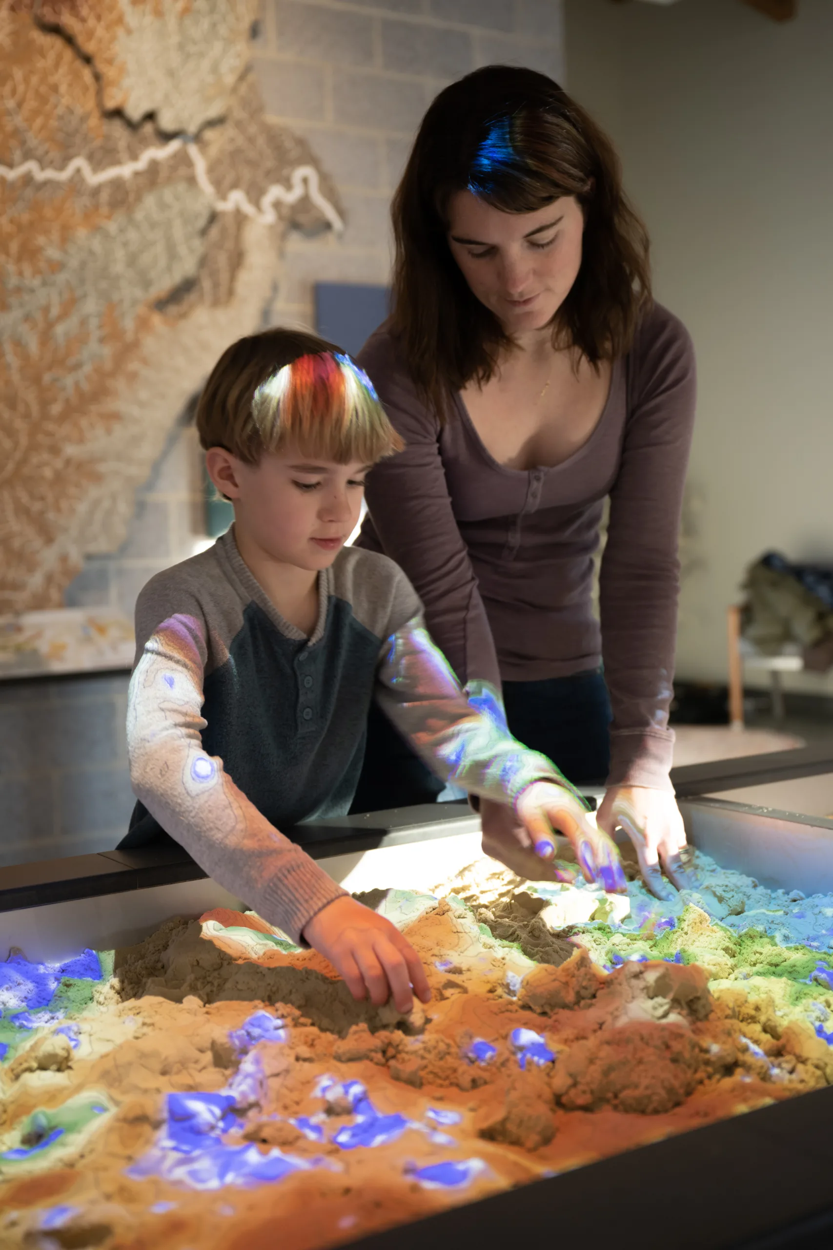 At the heart of the space are several immersive elements, including a touch tank modeled after a creek bed, a digital sandbox, and a large-scale model of a mussel that highlights the preserve’s aquatic life. Informative graphics and a biotic resources table offer opportunities for deeper discovery, allowing children and families to learn about the diverse ecosystems found throughout the surrounding landscape.